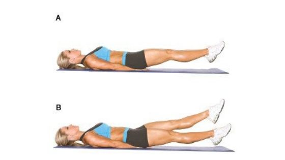 >>Deitada de costas no chão, mantenha as costas pressionadas e pernas esticadas.