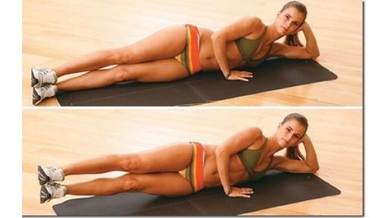 >>Apoie a cabeça em uma das mãos e eleve as duas pernas no sentido lateral, contraindo a região abdominal.